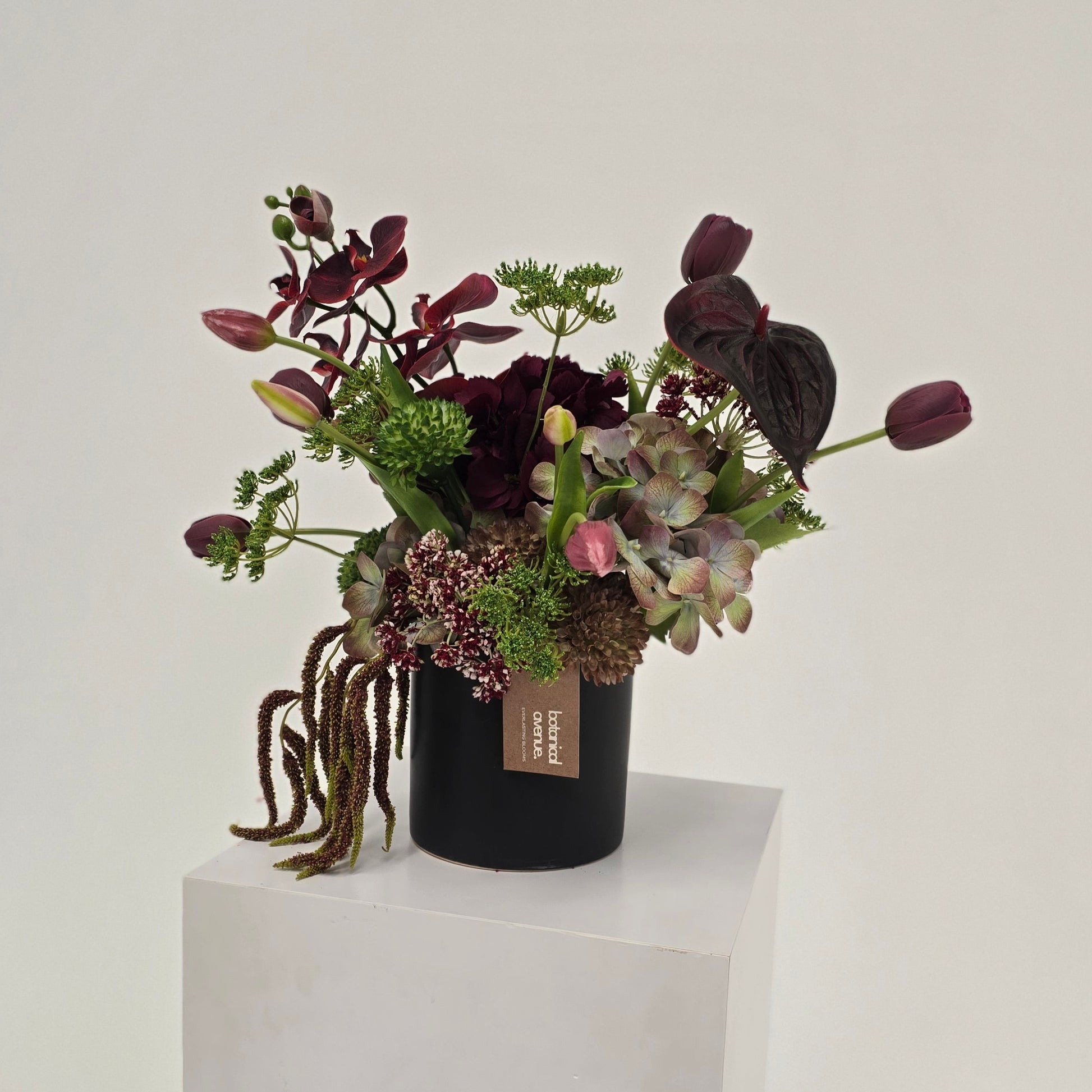 Elevate your winter space with Moody Wild Blooms, a stunning arrangement showcasing deep purples and lush greenery in a chic black vase.